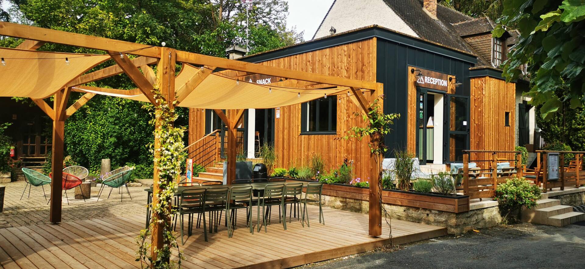 The snack bar, reception, and terrace completely redesigned (wood and vegetation instead of concrete),